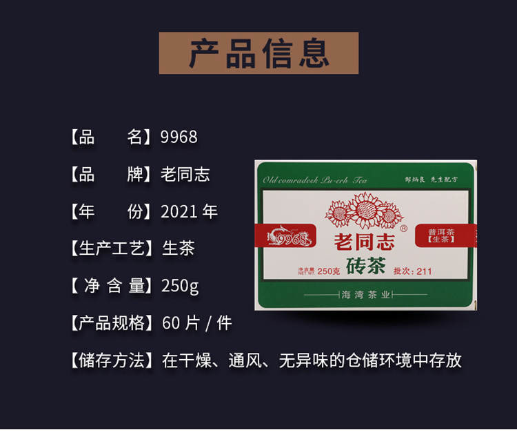 2021年老同志 9968砖茶 生茶 250克/砖 口粮茶