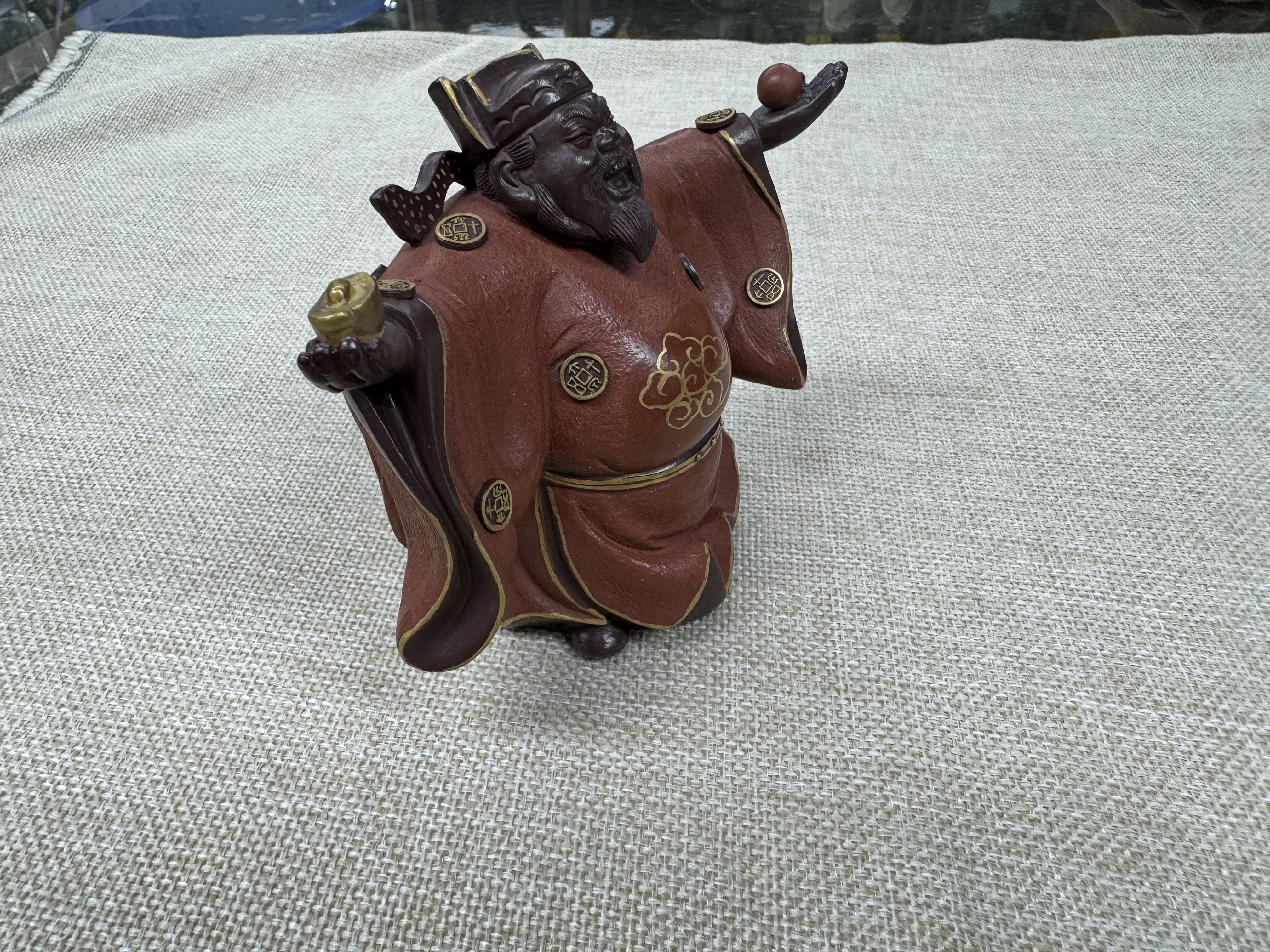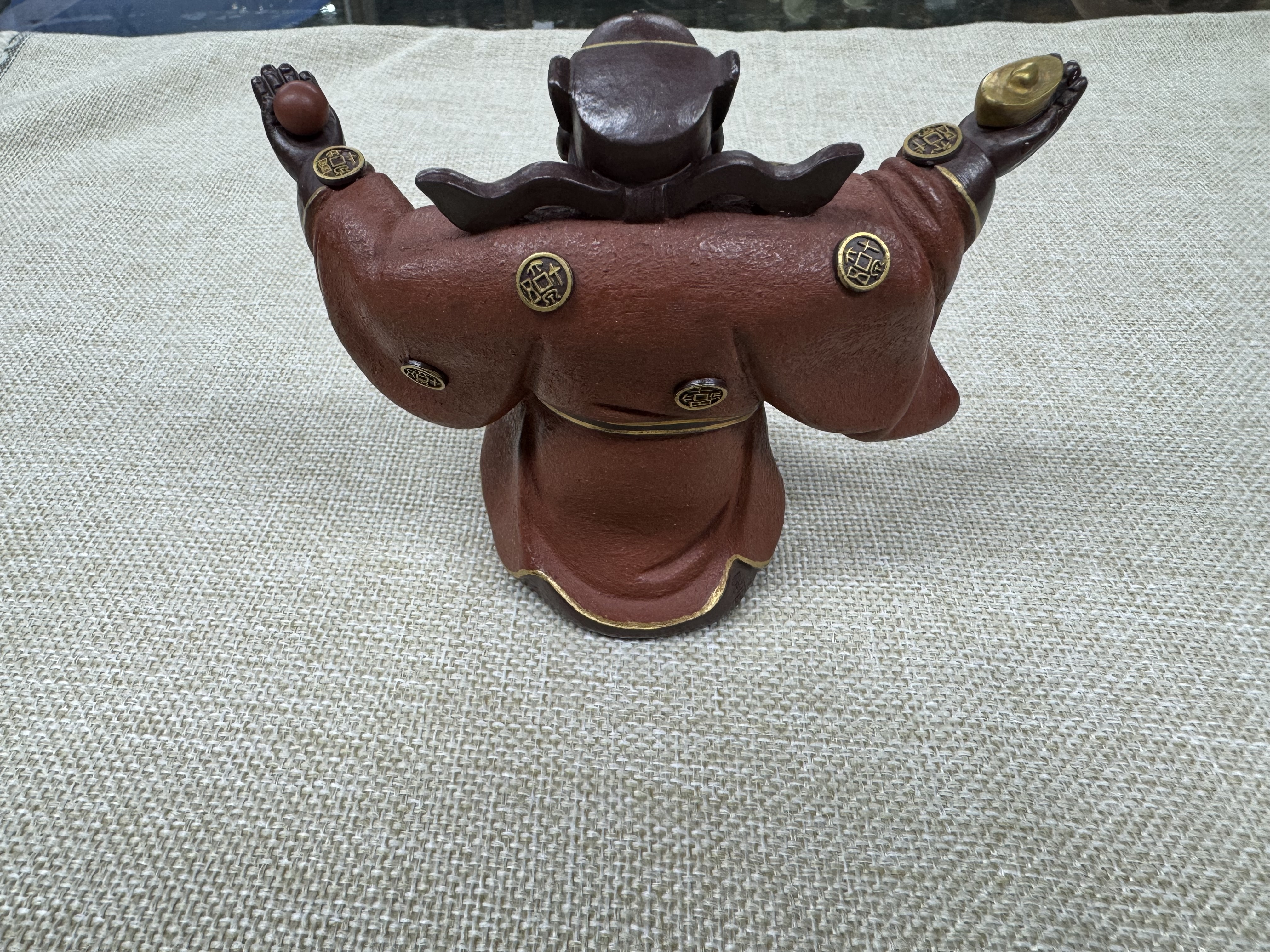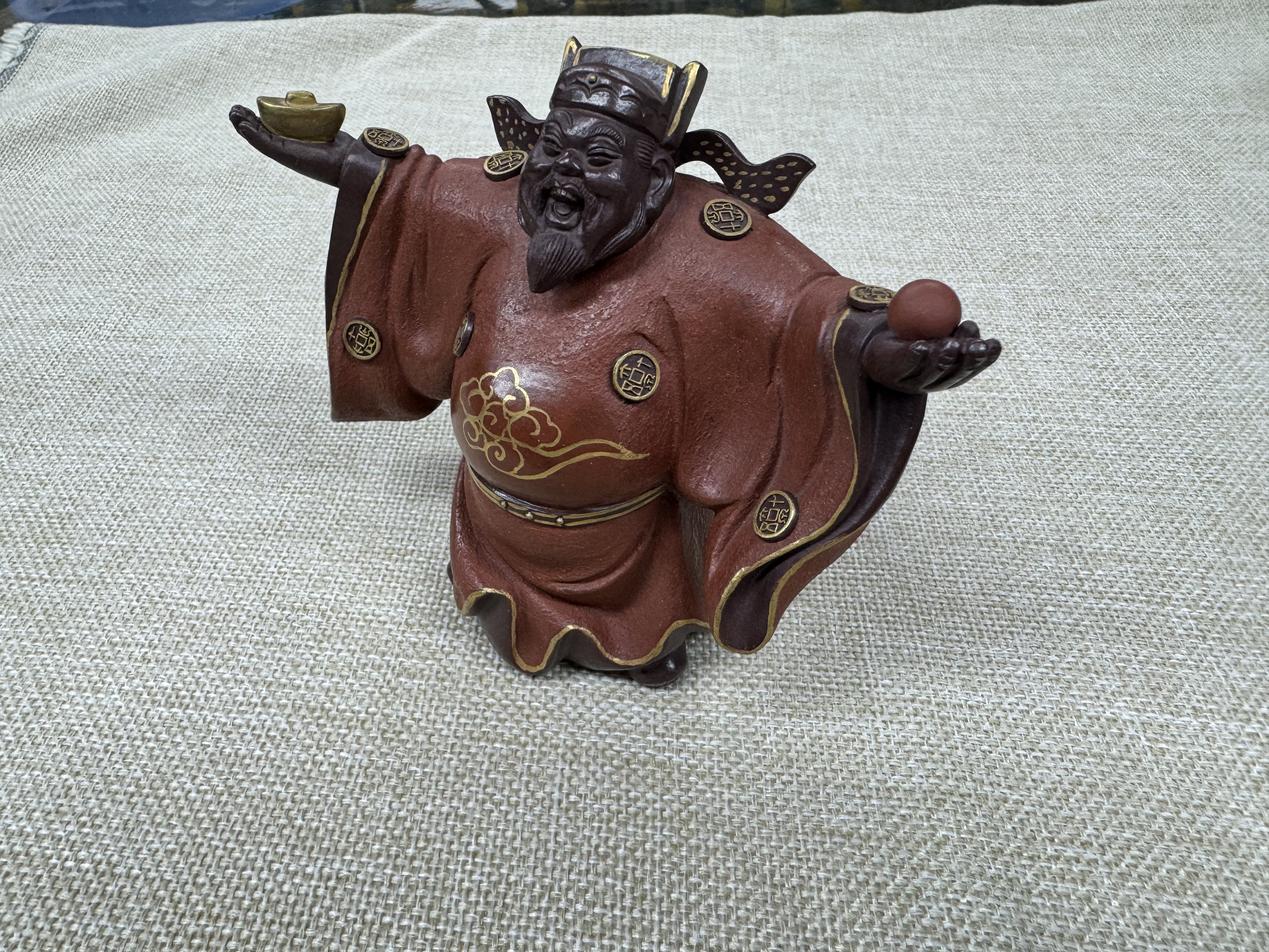 宜兴紫砂茶宠茶桌摆件精品纯手工可养财神爷描金24k双色粉浆雕塑