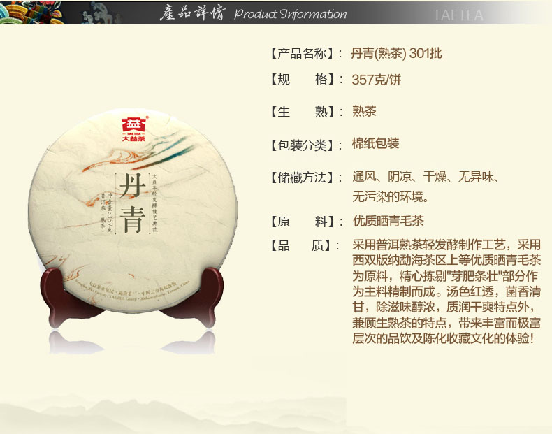 2013年大益 丹青熟茶 357克七子饼 轻发酵