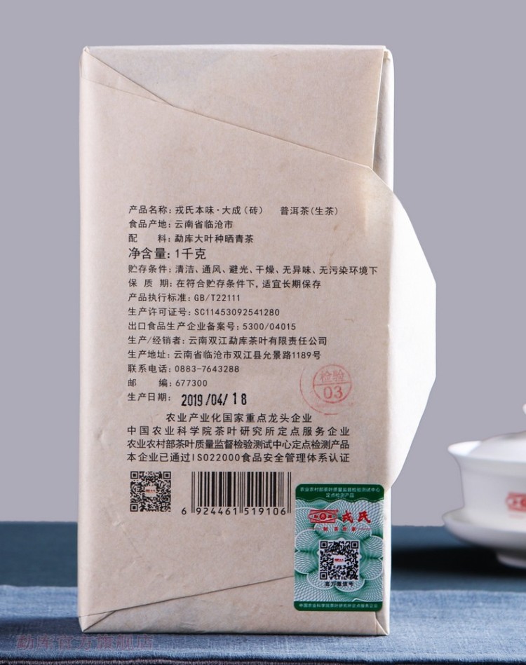 2019年勐库戎氏 本味大成-砖 普洱茶生茶 1000克