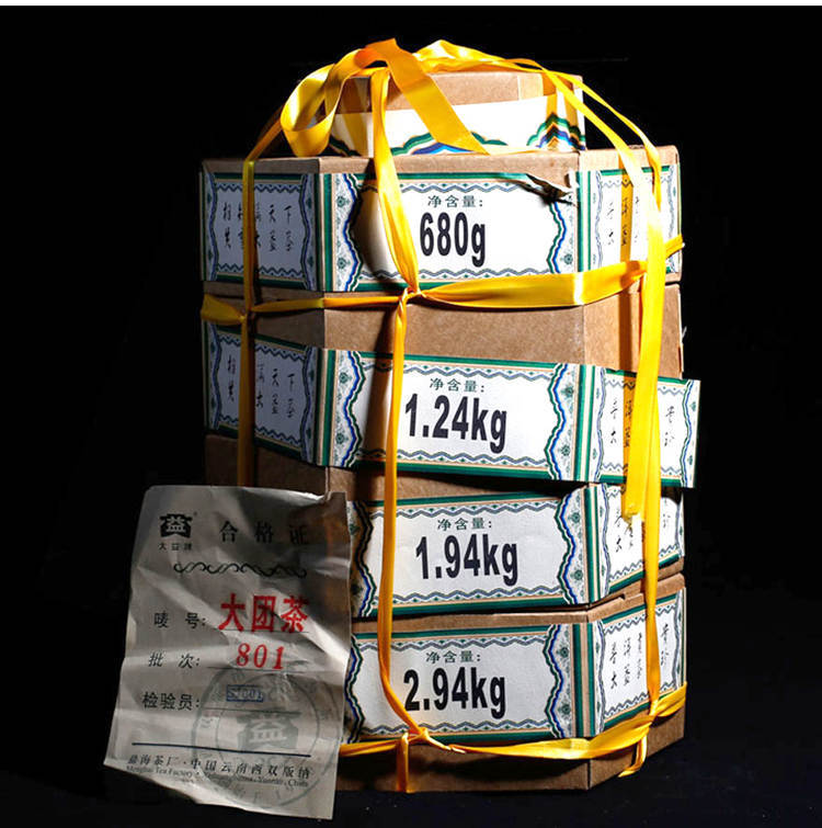 【商品介绍】大团茶是勐海茶厂68周年厂庆特别纪念茶,包括大团茶生茶和大团茶熟茶,规格6.8kg/套,由2.94kg、1.94kg、1.24kg金瓜茶和680克葫芦茶组成,具有独特的收藏价值。