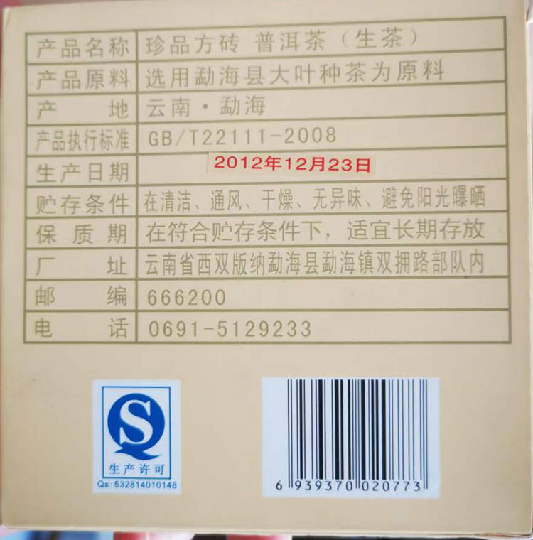 2012年福今茶业 珍品方砖 250克生茶砖茶