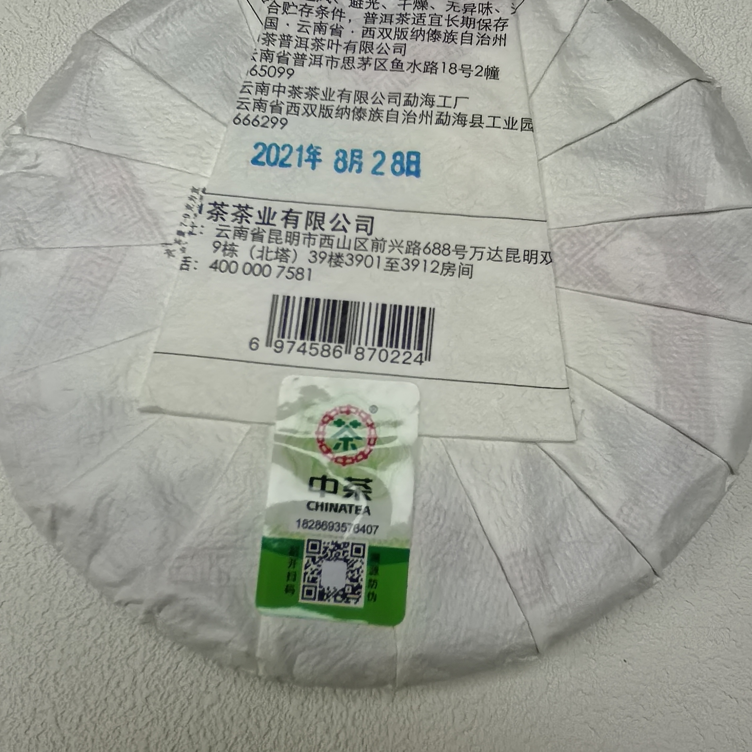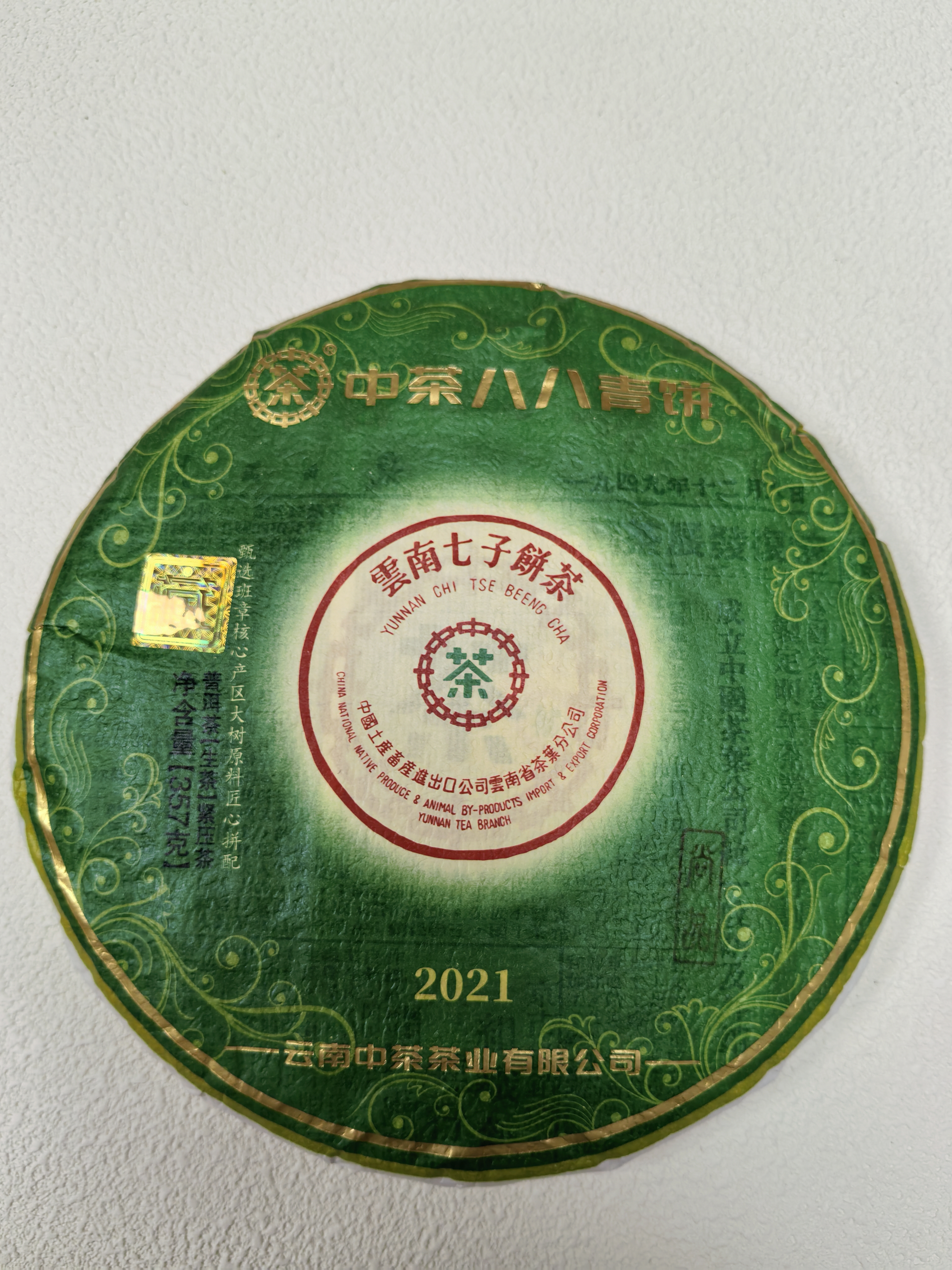 中茶2021年中茶八八青饼尚品普洱茶生茶饼357克/饼