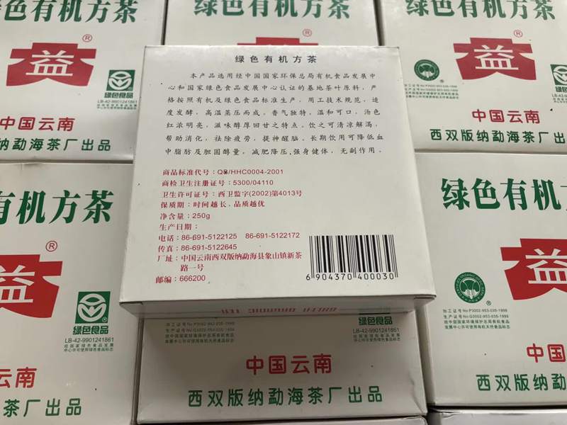 2004年401批绿色有机普洱方砖 250克,选用经中国国家环保总局有机食品发展中心和国家绿色食品中心认证的勐海核心茶区的原料,经国家级非物质文化遗产名录-大益茶制作技艺精心制作,整个加工生产环节严格按照有机及绿色食品标准生产,因茶品品质优异,深受广大茶人的追捧,且版面具有绿色食品和有机(天然)食品双认证,在市场上有着“小白菜”、“两只眼睛”等美誉,是勐海茶厂2004年出厂的十分难得的一款高端普洱熟茶(PS:勐海茶厂在1999年通过了绿色食品和有机(天然)食品双认证)。