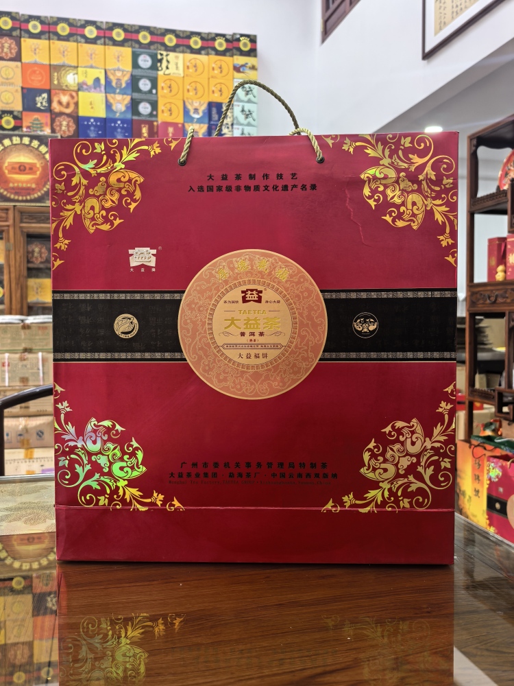 - 设计寓意:饼面以传统黄色为底,印满百福纹样,搭配“厚德载福”四字,是典型的“福文化”主题茶品,当年主打礼赠用途